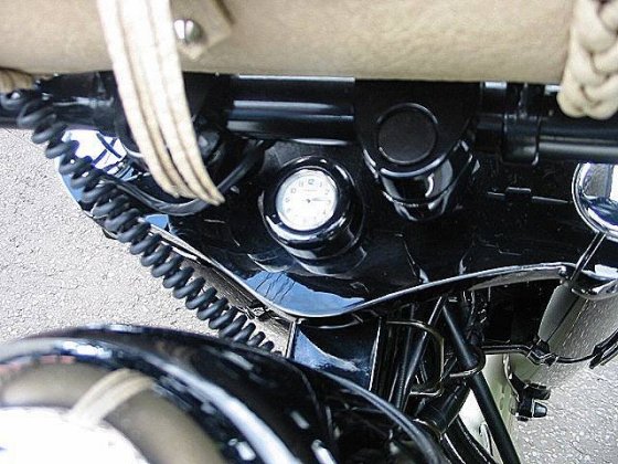 I made the clock mount from a BSA top yoke nut, which fits perfectly over the Drifter nut. The clock it'self is a modified £3.99 watch from Argos.!